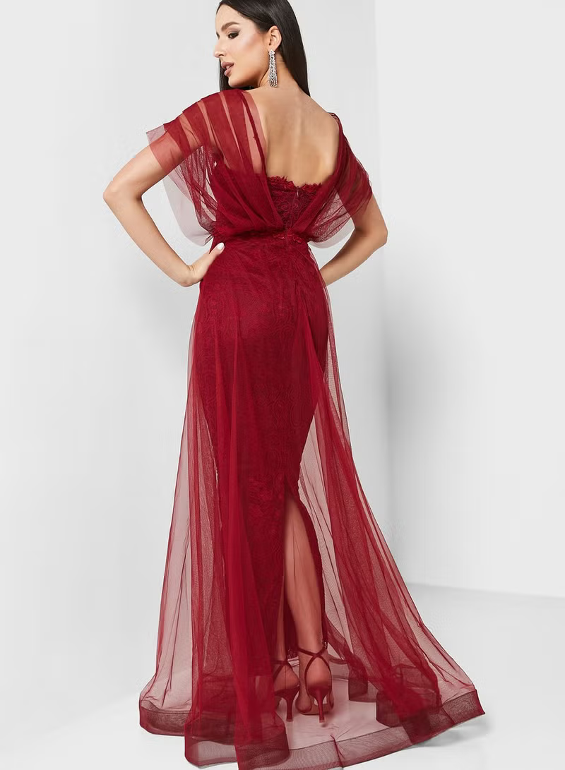 Perfect for weddings, galas, or evening events, this gown’s versatile design allows you to pair it with minimal jewelry for understated elegance or bold accessories for a striking look. Timeless and sophisticated, this lace overlay gown is a must-have for special occasions where you want to leave a lasting impression.