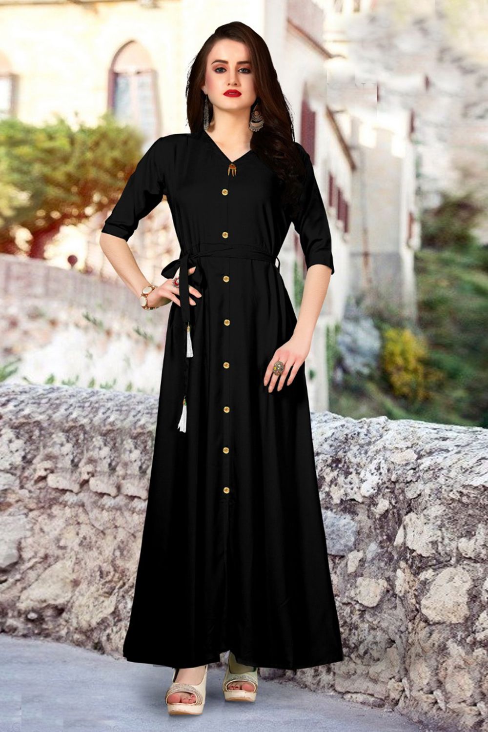 Elegant Black Full-Length Button-Down Rayon Kurti Dress with Tassel Tie-Up Belt