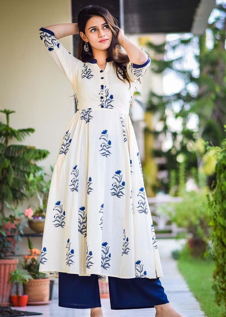- Color: White kurti with blue print, solid blue palazzo pants