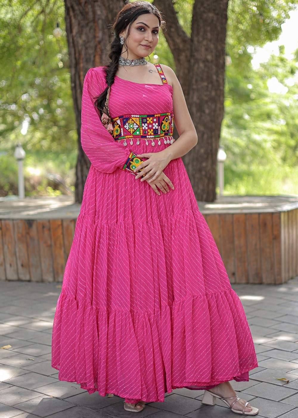 This elegant, floor-length gown is designed for festive occasions like Navratri. It features a vibrant pink color with a traditional ‘leheriya’ (wave-pattern) print and intricate Kutchi patchwork. The design blends traditional ethnic charm with a modern, party-wear look.