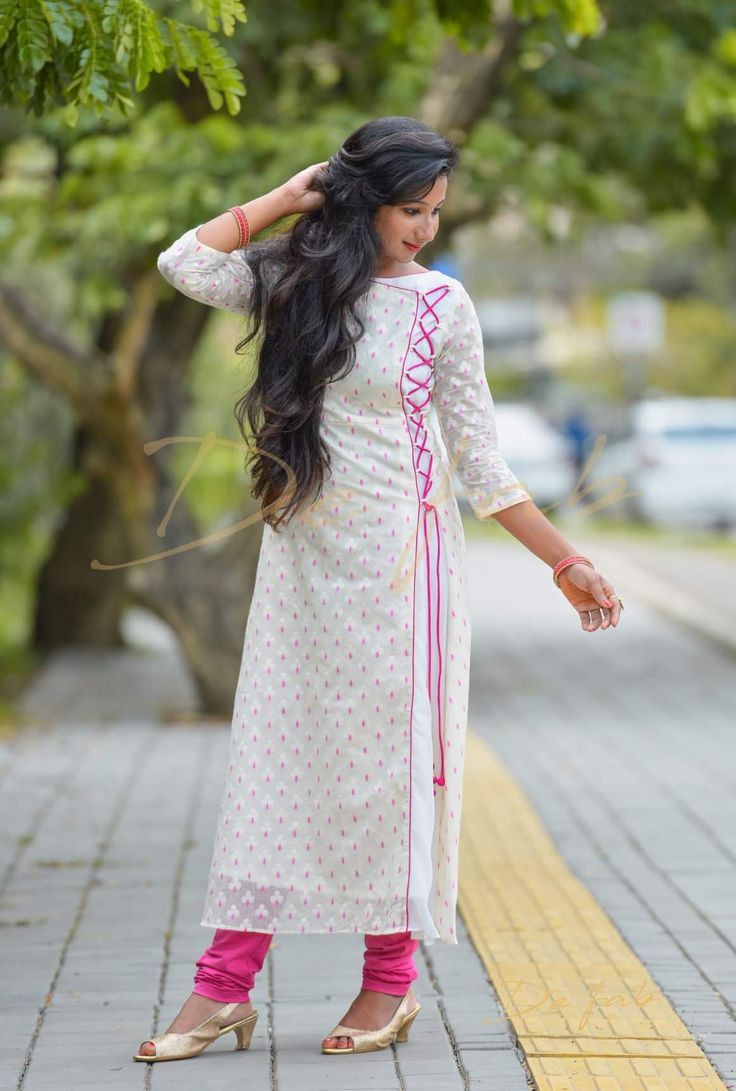 White and Pink Criss-Cross Lace-Up Cotton Kurti Set